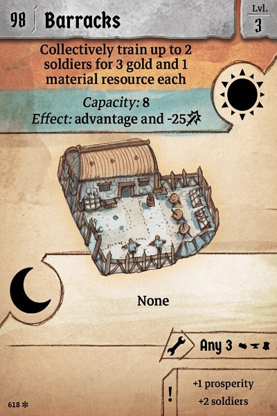 Collectively train up to 2 soldiers for 3 gold and 1 material resource each